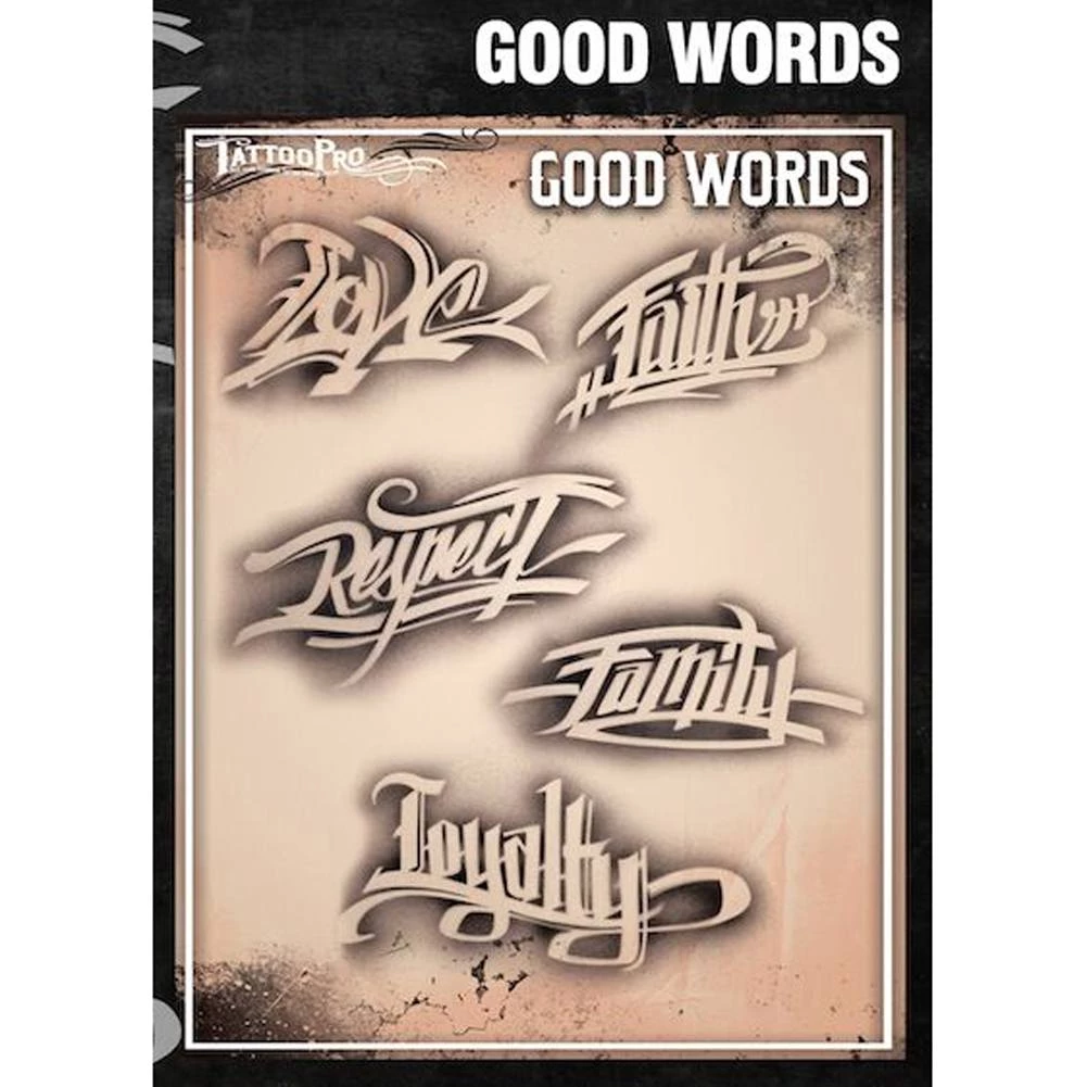 Tattoo Pro Series 3 Good Words Stencil design sheet contains stylized uplifting words such as Family, Faith, Loyalty, Love, Respect for creating realistic airbrush tattoos.