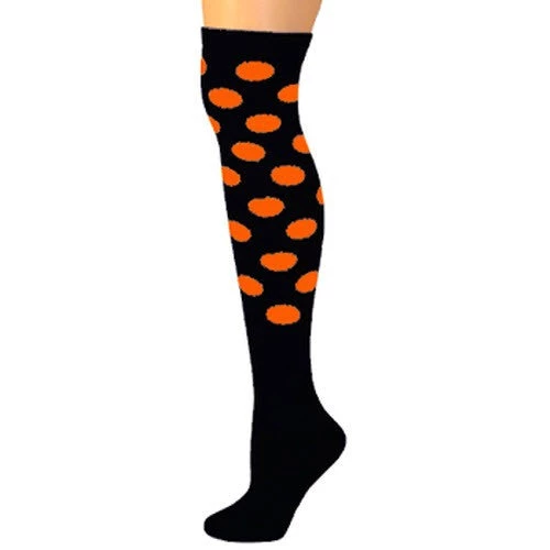Funky knee high socks with neon orange polka dots that extend from the top down to the ankle and a solid black, cushioned foot. We have a range of vivid colors. Made from 86% acrylic, 8% nylon and 6% elastic and sized to fit most adults (socks sizes 11 – 13, shoe sizes 5 and up), approximately 25 inches long.