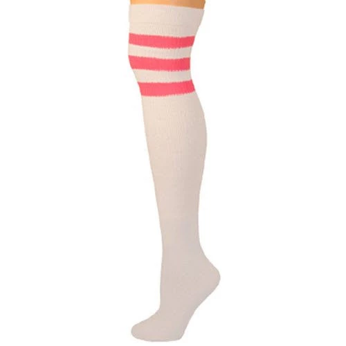These white socks have neon pink stripes at the top. They are 29 inches long, and made from 86% acrylic, 8% nylon and 6% elastic. They are very stretchy, but hold their shape once pulled on.
