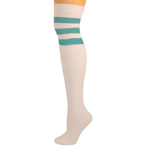 These white socks have turquoise stripes at the top. They are 29 inches long, and made from 86% acrylic, 8% nylon and 6% elastic. They are very stretchy, but hold their shape once pulled on.