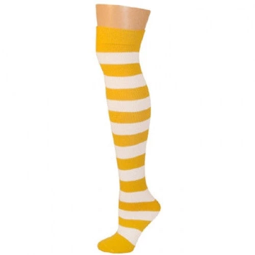 These knee sock are high quality and versatile. They come in fun gold and white stripes and are tube socks so you don’t have to worry about a toe, heel or foot length. The leg is made made of acrylic and spandex and have a padded foot. It’s even striped all the way to the tippy toe.