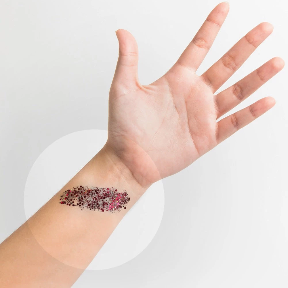 Glitter Creme is made of mostly 0.008 hex fine polyester glitter, but has small amounts of 0.025 hex glitter for extra dimension. While it is safe to use for body painting, caution is recommended for use on face. Not recommended for use near eyes, especially for children.