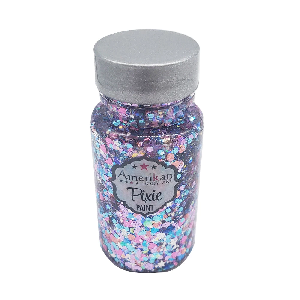 Amerikan Body Art Pixie Paint Glitter Gel, now available in exclusive Limited Edition Party Size, great for festival makeup, parties and to be used on your face, body or hair. Amerikan Body Art Pixie Paint is a sparkling mix of chunky and fine glitter in an aloe glitter base. Amerikan Body Art Cupcake Day Pixie Paint is a mix of opaque pink, blue and silver star chunky glitter. Limited Edition Party Size, comes in 1.3 ounce size.