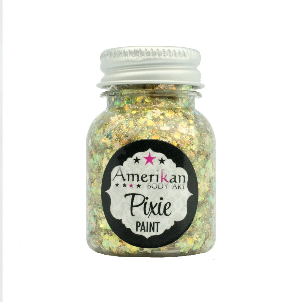 Amerikan Body Art Pixie Paint is a sparkling mix of chunky and fine glitter in an aloe glitter base. Amerikan Body Art Lucky Star Pixie Paint is a mix of iridescent and golden stars.