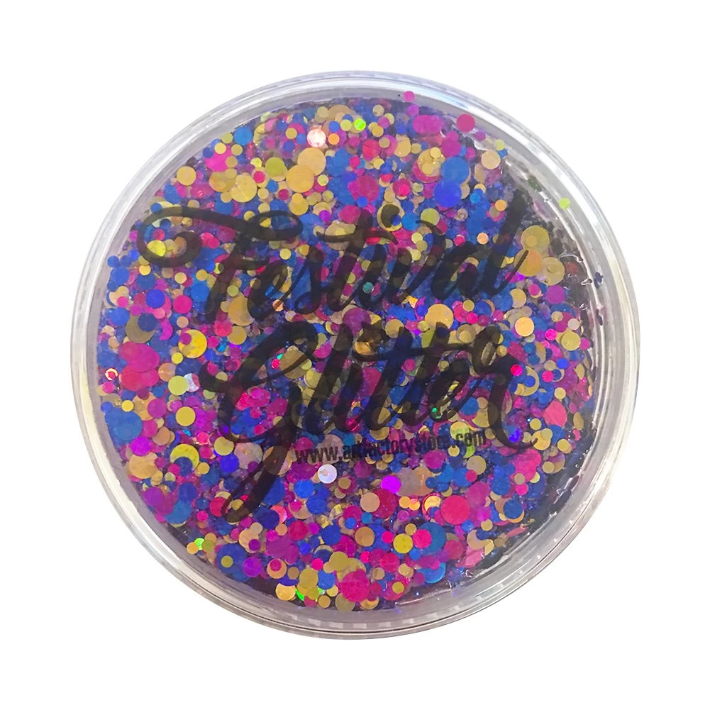 Festival Glitter gel has excellent sticking power and offers a great level of control in application. Holographic reflective glitter provides sparkling rainbow effects in sunlight. Glitter can be applied easily using a silicone spatula or filbert brush. Can be used on hair for creating glitter roots or for creating glitter chests. Festival Glitter can be easily removed with soap and water.
