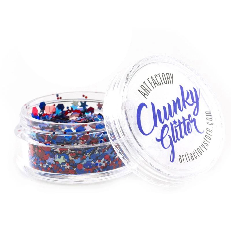 Art Factory Fireworks Chunky Glitter is made of loose, cosmetic grade polyester glitter in higher particle size, for application on hair and body. Art Factory Chunky Glitter is a mix of holographic glitter colors and shapes that can be used to create amazing body art. Comes in 10 ml jar. Actual weight might vary by color, as glitter colors vary in density.