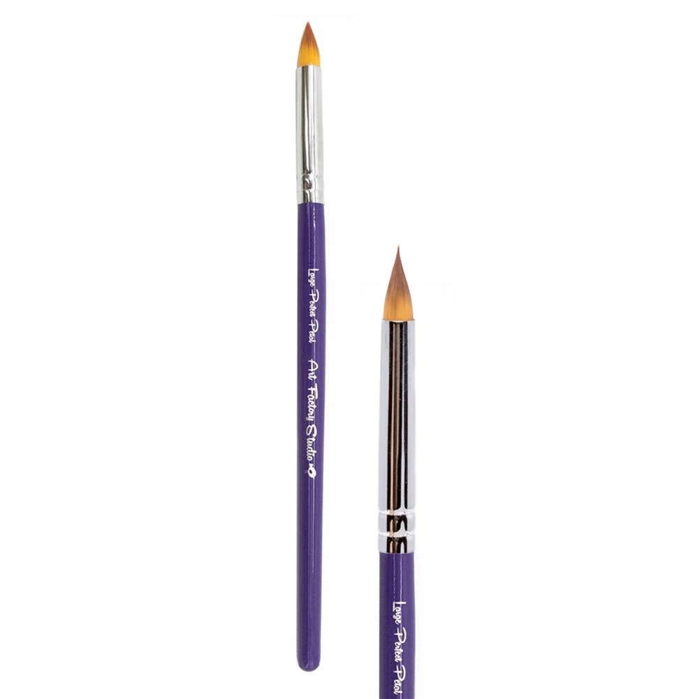 Art Factory Studio Round Brushes are long lasting, synthetic brushes that provide the perfect bounce for face painting. Art Factory brushes come with light weight, purple painted wooden handles that are very comfortable, even for long gigs. Brushes feature nylon bristles and nickel plated ferrules. Art Factory Brushes are made without harming any animal. Large Perfect Petal Brush can be used for painting large flower petals. Bristles are perfectly shaped to help you start with a sharp point and end with thick, round flower petals. This brush can be purchased with other Art Factory brushes in a 11 Brush Set.