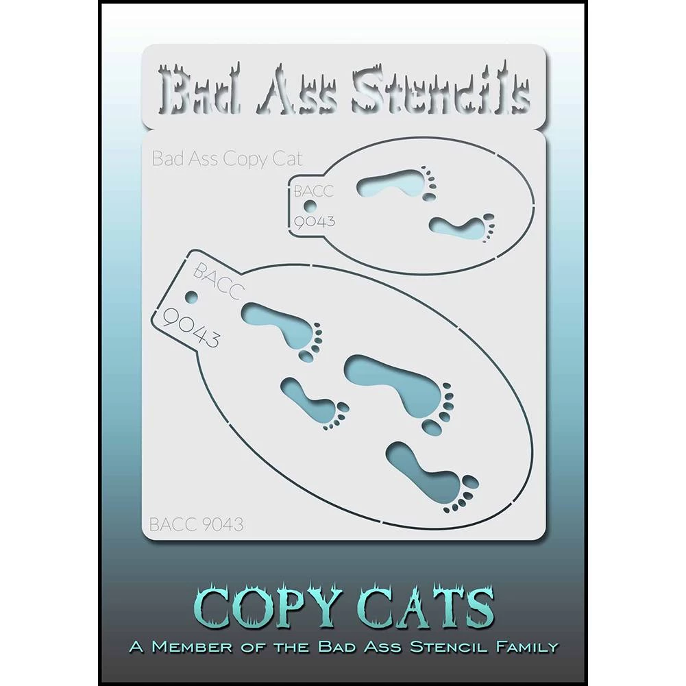 Bad Ass Copy Cat Stencils – Footprints (9043) work great for adding design details over face and body. Each sheet is 5.5″ x 3″ with two stencils that can be separated and used to create multiple designs based on same pattern. Each Copy Cat Stencil has one mini stencil (3.5″ x 5″) and one half ass stencil (3.3″ x 2″), both based on a common design pattern. Each stencil piece can be taken apart and used individually to create designs of different sizes on different parts of the body.