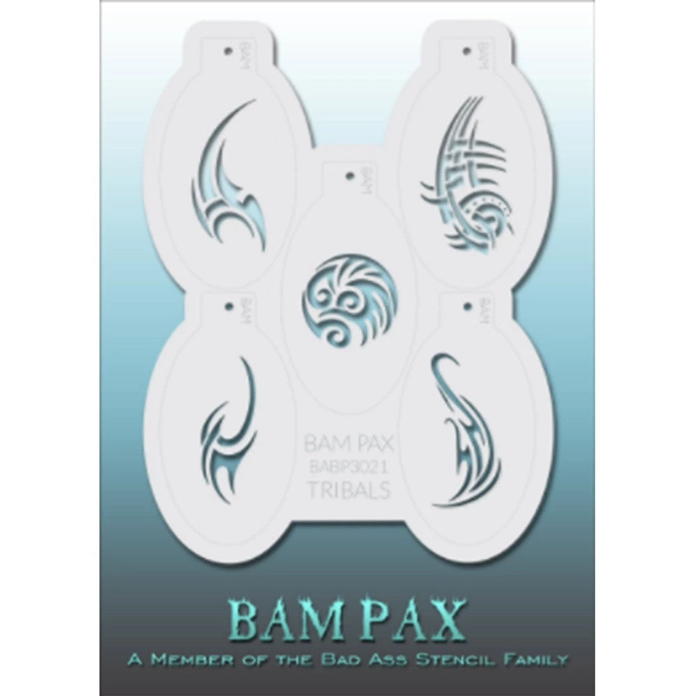 BAM-PAX Stencils from the Bad Ass Stencil line are great for adding creative details over face and body. Each sheet contains five stencil designs in the same theme. Individual stencils can be taken out from the sheet and stored together using the metal chain included. The Tribals BABP 3021 Stencil contains 5 different stencil designs in tribals theme, each approx. 5″ x 3″ in size. BAM PAX Stencils are great for creating designs quickly in birthday parties and other events.