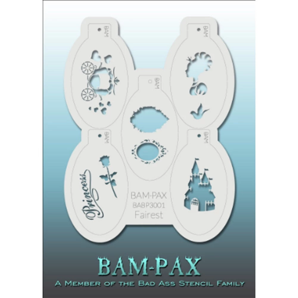 BAM-PAX Stencils from the Bad Ass Stencil line are great for adding creative details over face and body. Each sheet contains five stencil designs in the same theme. Individual stencils can be taken out from the sheet and stored together using the metal chain included. The Fairest BABP 3001 Stencil contains 5 different stencil designs in princess theme, each approx. 5″ x 3″ in size. BAM PAX Stencils are great for creating designs quickly in birthday parties and other events.