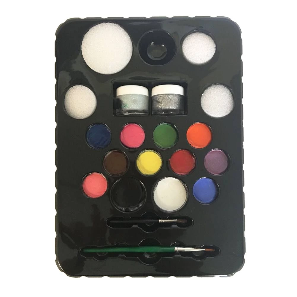 Includes 2 x 2ml Black and White; 8 x 1ml Classic Colors bright yellow, bright red, grass green, orange, royal blue, sky blue, pale pink and dark brown. Plus 2 x Sparkle colors sparkle lilac and sparkle pink. It has 2 x 8ml glitter gels in star dust and silver. Also included are 4 sponges and 2 paint brushes and a step by step instruction guide.