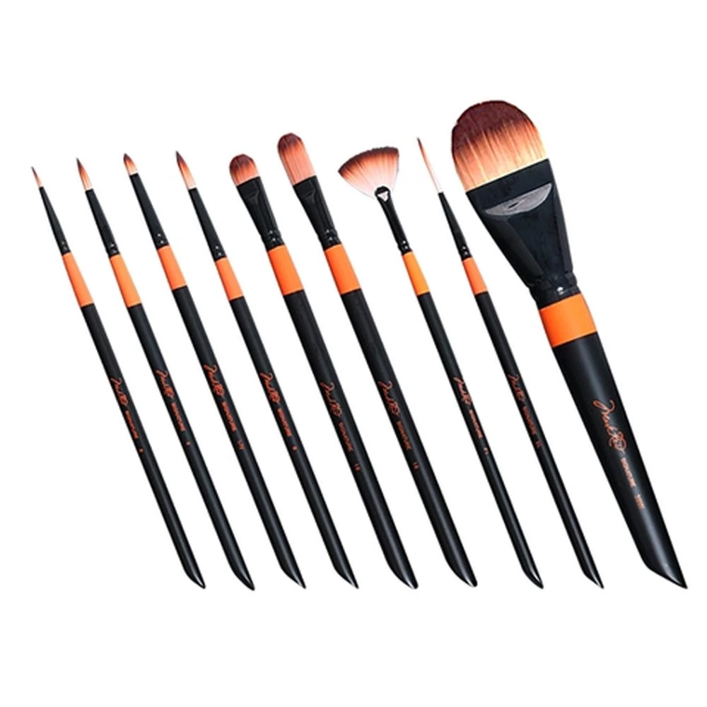 Mehron Mark Reid Signature Brushes were created to the specifications of world famous face & body artist and instructor Mark Reid. The brush bristles are a beautiful two- tone nylon, incased in a sturdy brass ferrule which is coated black for an attractive appearance and function. The custom-shaped brush handles are made of wood coated with urethane for durability and designed for the professional face painter. An important feature of Mark Reid Signature buttons is the precisely angled end on each handle which is designed to help gently move any unwanted strands of hair, etc. without smudging the art work by touching the model with fingers.