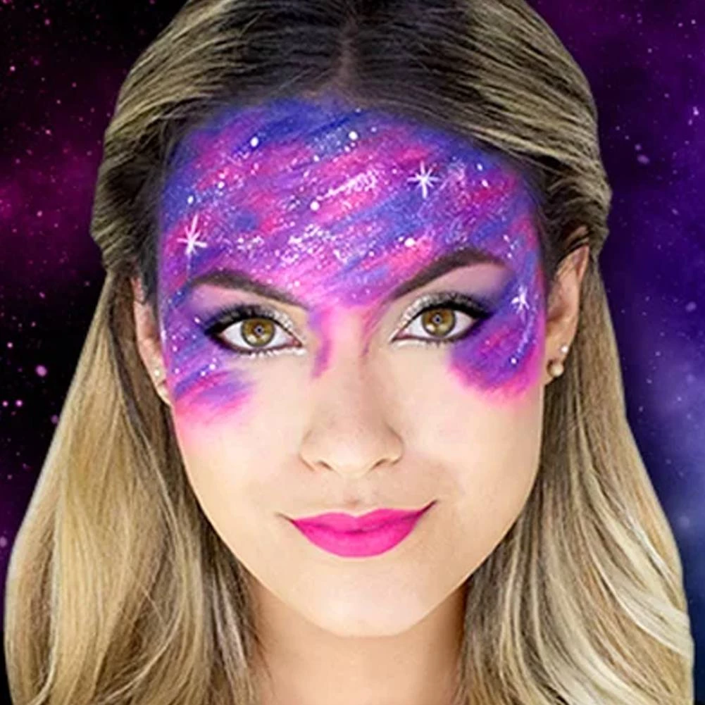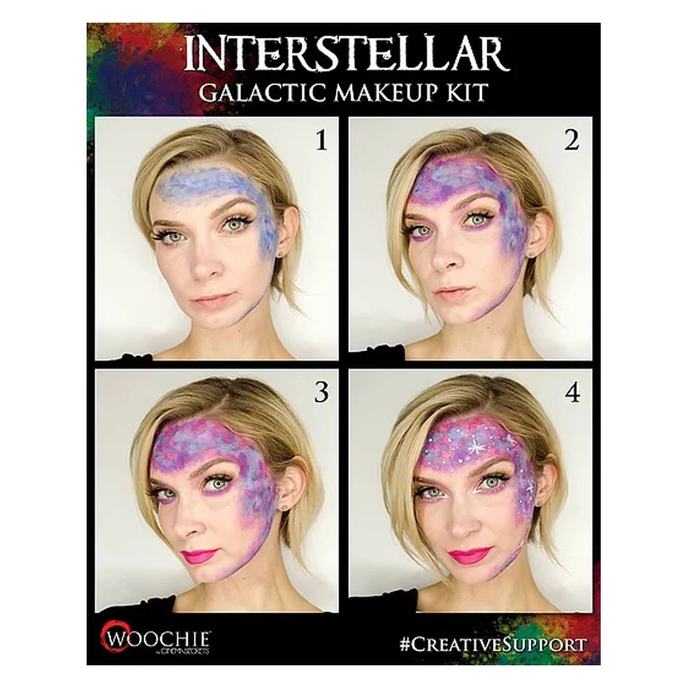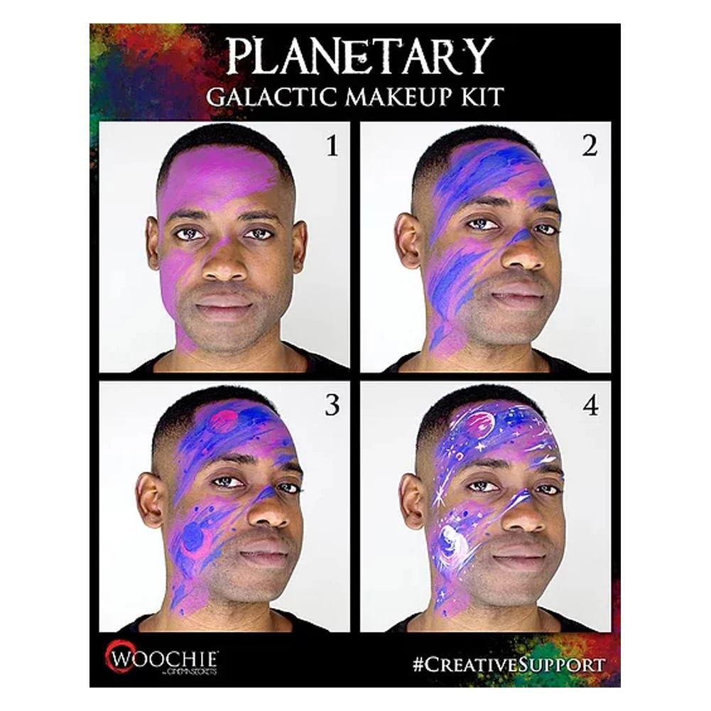 Woochie Water Activated Makeup Kit – Galactic contains five colors of Woochie Water activated makeup to create special effects for Halloween, cosplay, parties or stage. Galactic kit contains colors: Pink, Blue, Purple, White & Silver water activated makeup (0.07 oz / 1.98 gm of each color), two brushes and a latex-free sponge.