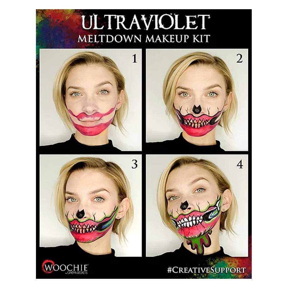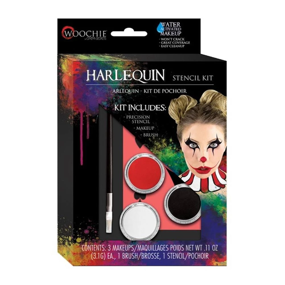 Woochie Water Activated Stencil Makeup Kit – Harlequin contains three colors of Woochie Water activated makeup to create special effects for Halloween, cosplay, parties or stage. Harlequin Kit contains colors: Red, Black & White (0.11 oz / 3.1 gm of each color), one brush and one stencil.