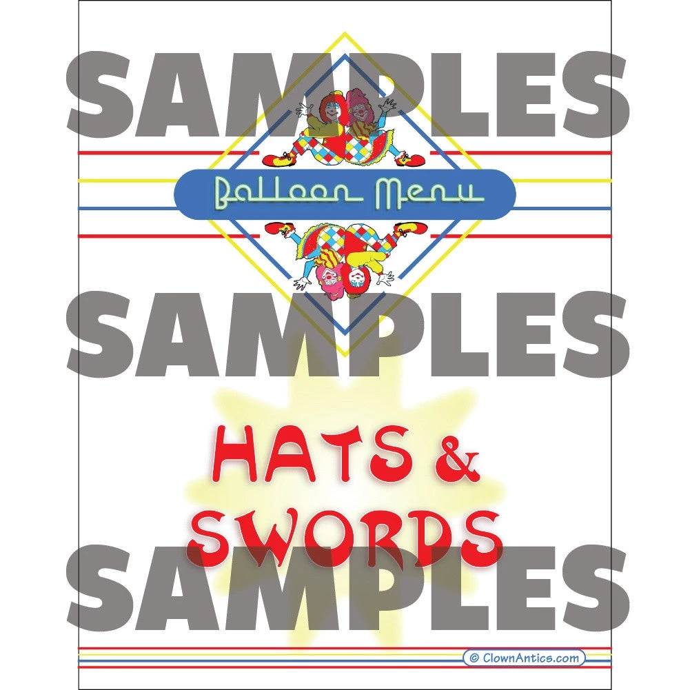 ClownAntics is happy to present to you our all new “Balloon Menu”, with exciting and colorful balloon designs. This restaurant style menu features four pages of multi colored designs such as hats and swords. Balloon menu has a burgundy pocket cover with clear viewing surfaces for design visibility. The menu cover has stylish and protective burgundy vinyl borders with brass corners. The colorful illustrations are great way of engaging your customers as they wait for their turn or a great entertainment for balloon twisters at birthday parties and other group events.