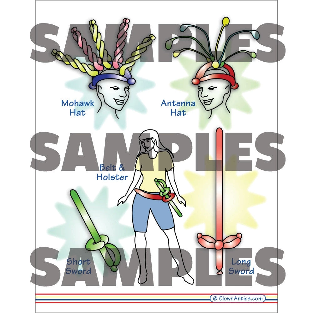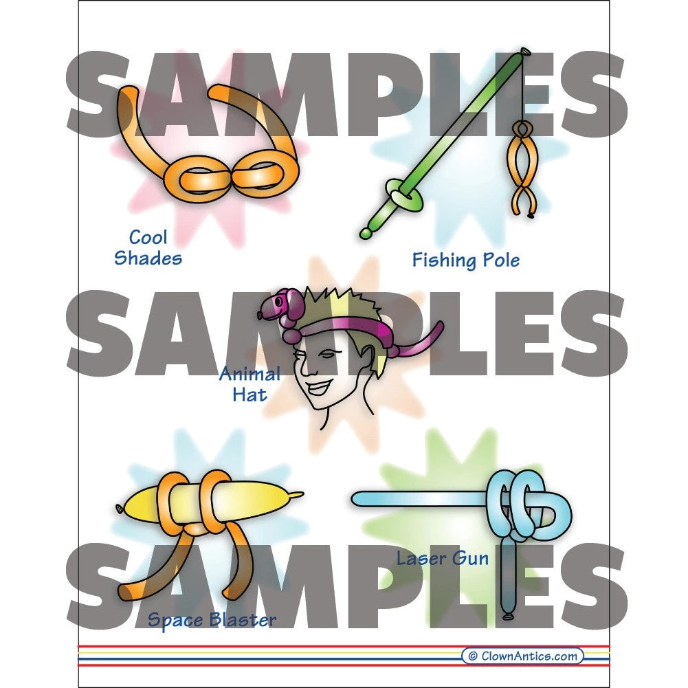 Includes the following balloon designs: Cool Shades, Fishing Pole, Animal Hat, Space Blaster, Laser Gun, Mohawk Hat, Antenna Hat, Short Sword, Belt & Holster and Long Sword.