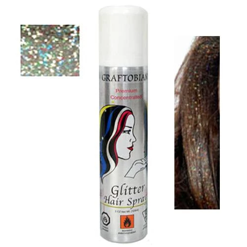 Graftobian Glitter Spray is very colorful spray-on hair color for great costume hair color. Graftobian’s hair color is professional grade hair color made with the highest quality ingredients from Germany. Glitter Spray can also be used on your skin when you need some extra sparkle. A container of Graftobian Glitter Spray is good for about 2 to 3 full heads or 7 to 10 streaks and tips.
