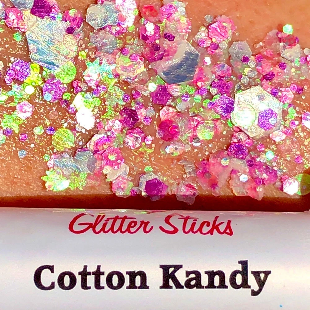 Creative Faces Glitter is cosmetic grade polyester glitter in a balmy base that can be used by itself or along with face paints. Cotton Kandy is a mix of different sizes and shapes of pink, yellow, gold and silver chunky glitter. See all available colors here.Â