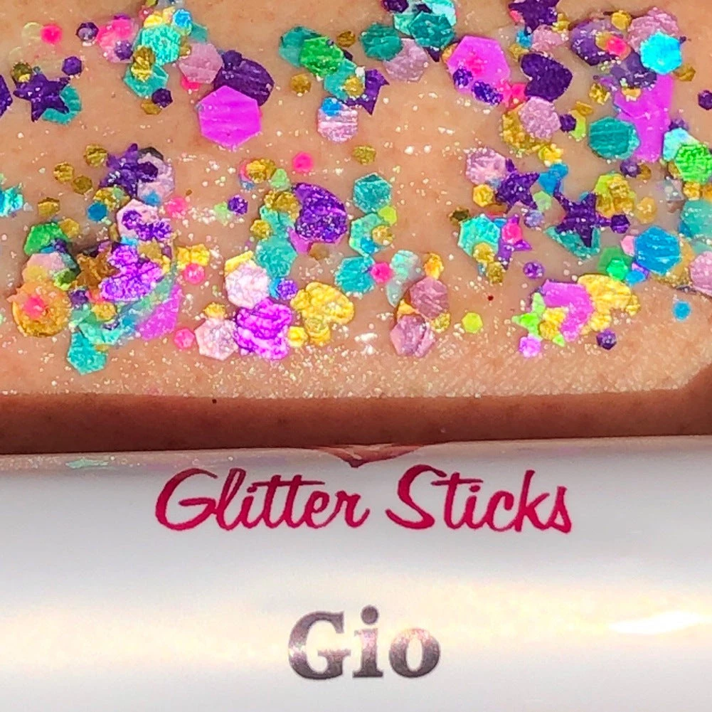 Creative Faces Glitter is cosmetic grade polyester glitter in a balmy base that can be used by itself or along with face paints. Gio is a mix of different sizes and shapes of purple, green, gold and silver chunky glitter. See all available colors here.Â