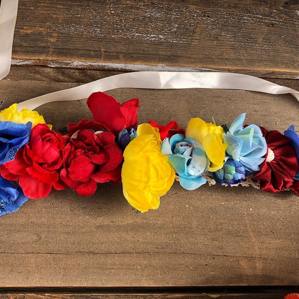 Each Creative Faces Crown is one of its kind, handmade in the USA using paper and silk flowers on a felt or denim base. One size fits all. Just fit to the desired size and then tie. Perfect to complete your outfit in weddings, fairs, events, parties or face painting events.