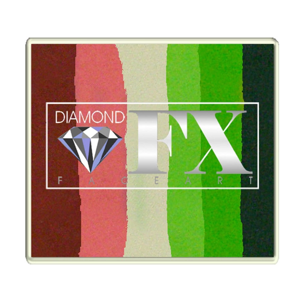 Diamond FX 50 gm Split Cakes are conveniently packaged in a rectangular container with clear plastic lid. Diamond Fx Split Cakes are perfect for creating colorful designs in seconds. Perfect for group painting events such as parties, celebrations and festivals. Use a face painting sponge or a big brush to pick up multiple colors at once and create fast, multi-color designs. Designed to stay all day without cracking or fading.