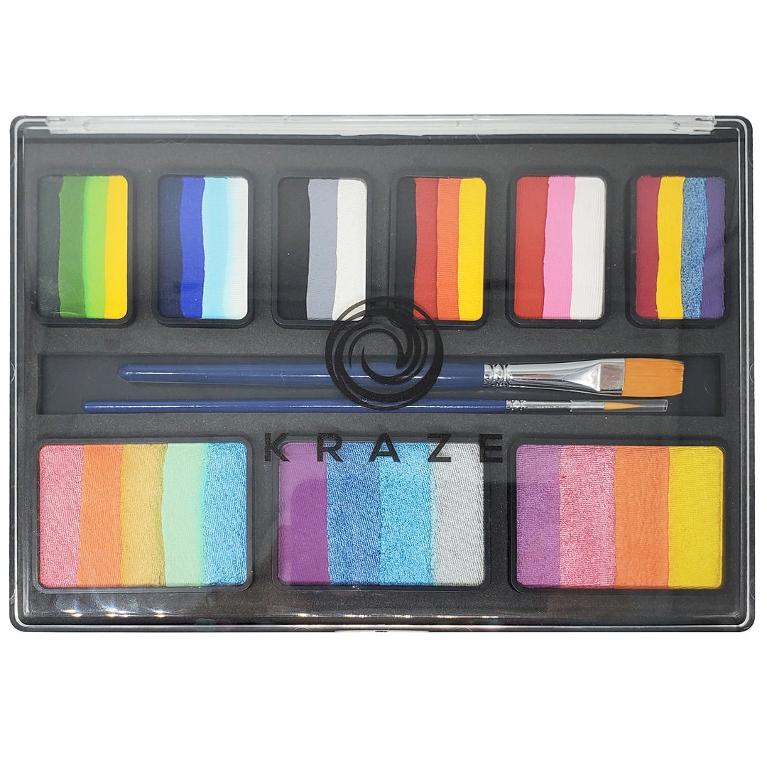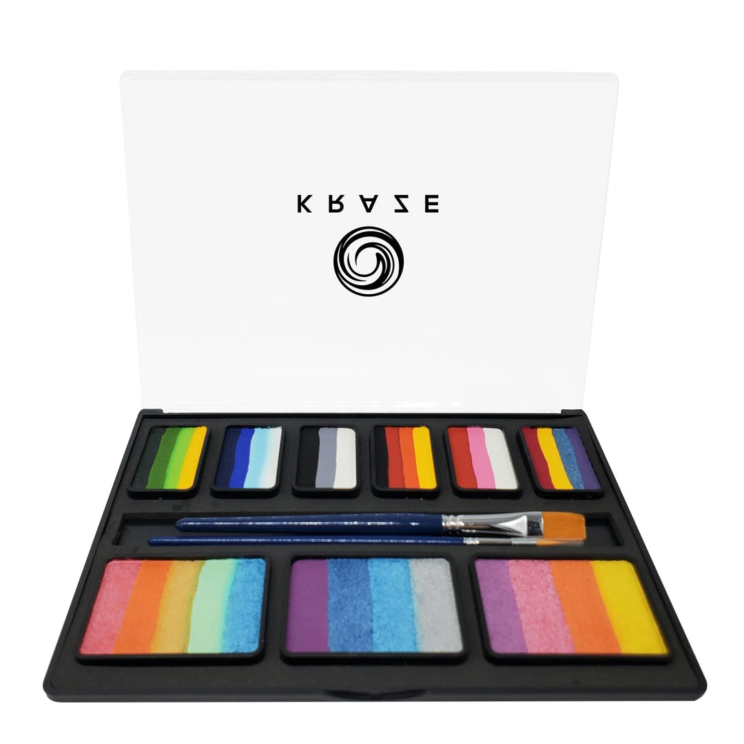 Kraze FX One Stroke Cakes and Split Cakes can be used to create colorful designs quickly and easily. Perfect to create a range of designs for parties, events, fairs or Halloween. Kraze FX Celebration Split Cake Palette has 10 gm each of six one stroke cakes, 20 gm each of 3 large Split Cakes and two face painting brushes. Dimensions: 9.05″ x 6.30″ x 0.5″. Celebration Palette will give approximately 500 applications.