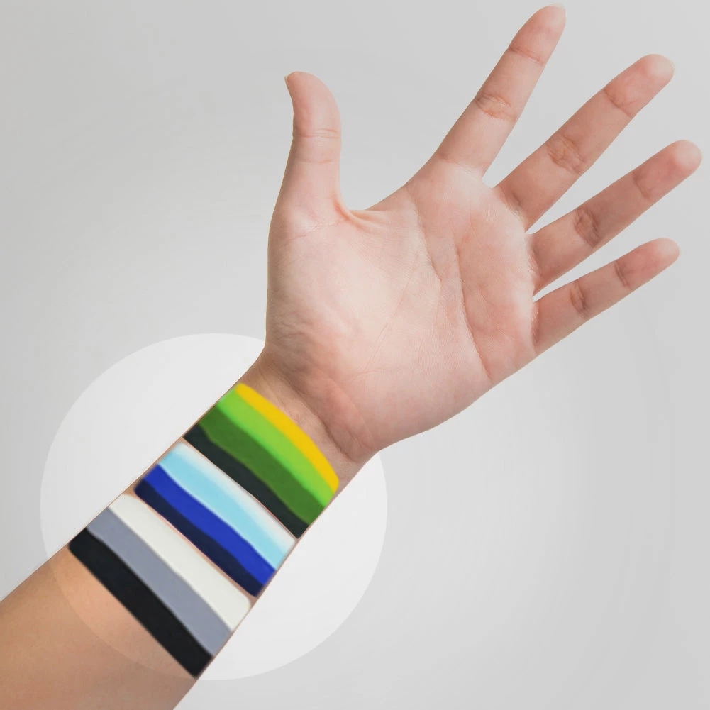 Kraze Face Paints are made with high quality, US FDA & EU compliant ingredients that are safe to use anywhere in the body. Kraze Paints are hypoallergenic and free of nut based ingredients, gluten, perfume or paraben. Kraze formula is vegan; made without any animal based ingredients without any testing on animals. Due to possible staining issues, US FDA warns against use of red, yellow, orange or purple paints near eyes and blue, green or purple shades near lips. Neon colors are not recommended for use on skin for a long time.