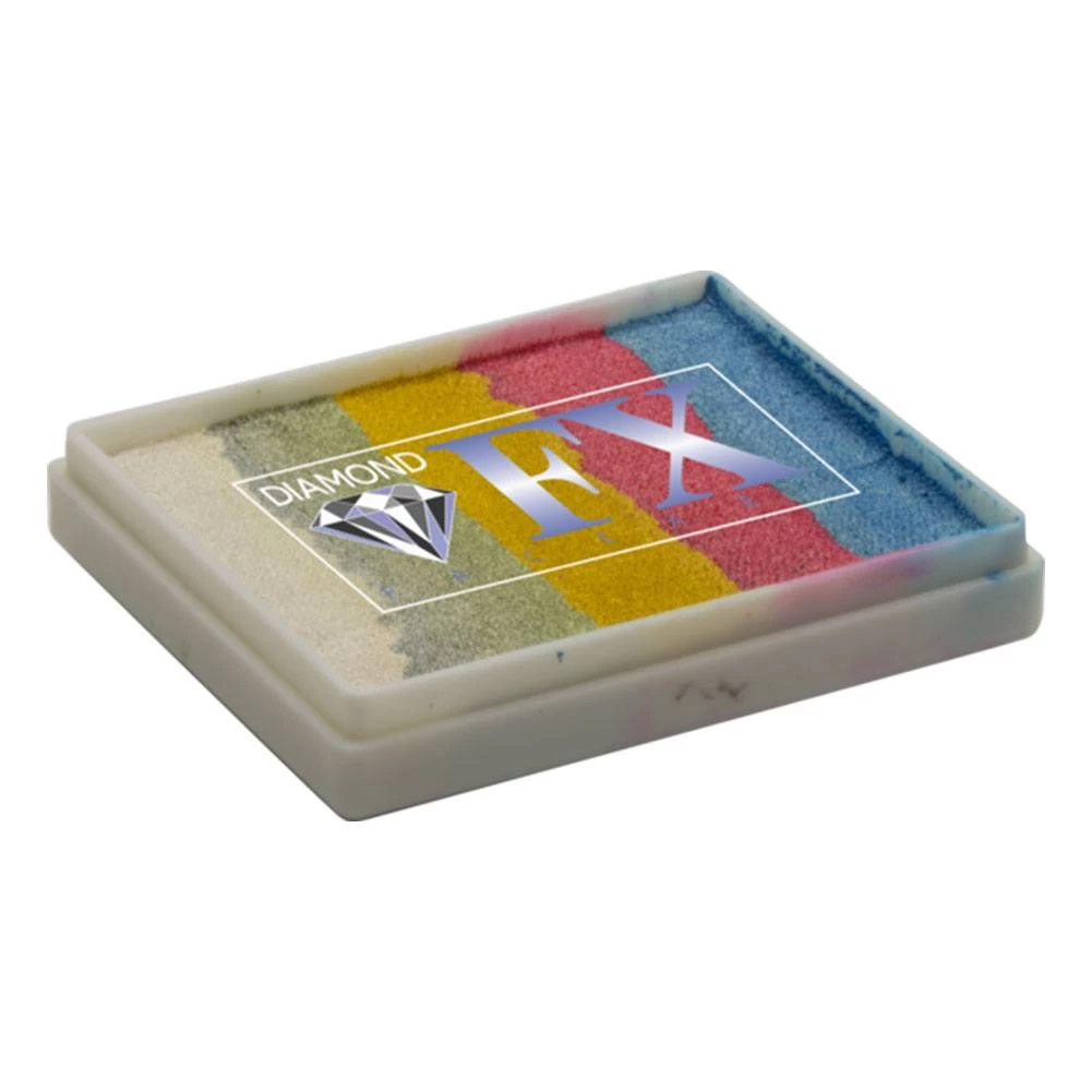 Diamond FX 50 gm Split Cakes are conveniently packaged in a rectangular container with clear plastic lid. Diamond Fx Split Cakes are perfect for creating colorful designs in seconds. Perfect for group painting events such as parties, celebrations and festivals. Use a face painting sponge or a big brush to pick up multiple colors at once and create fast, multi-color designs. Designed to stay all day without cracking or fading.