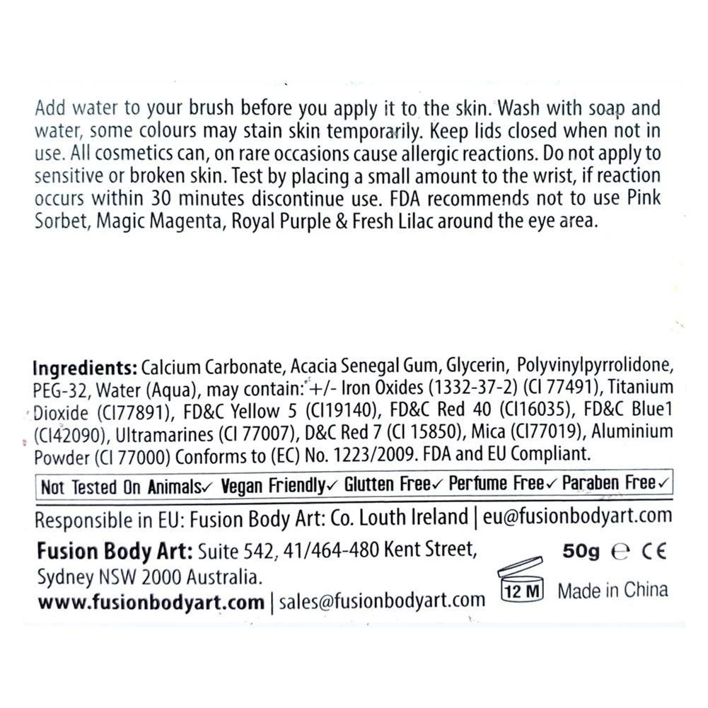 Fusion Body Art Paints are made with high quality, US FDA & EU compliant ingredients that are safe to use anywhere in the body. Fusion Paints are hypoallergenic and free of perfume, lanolin, gluten or paraben. Fusion formula is vegan; made without any animal based ingredients without any testing on animals.