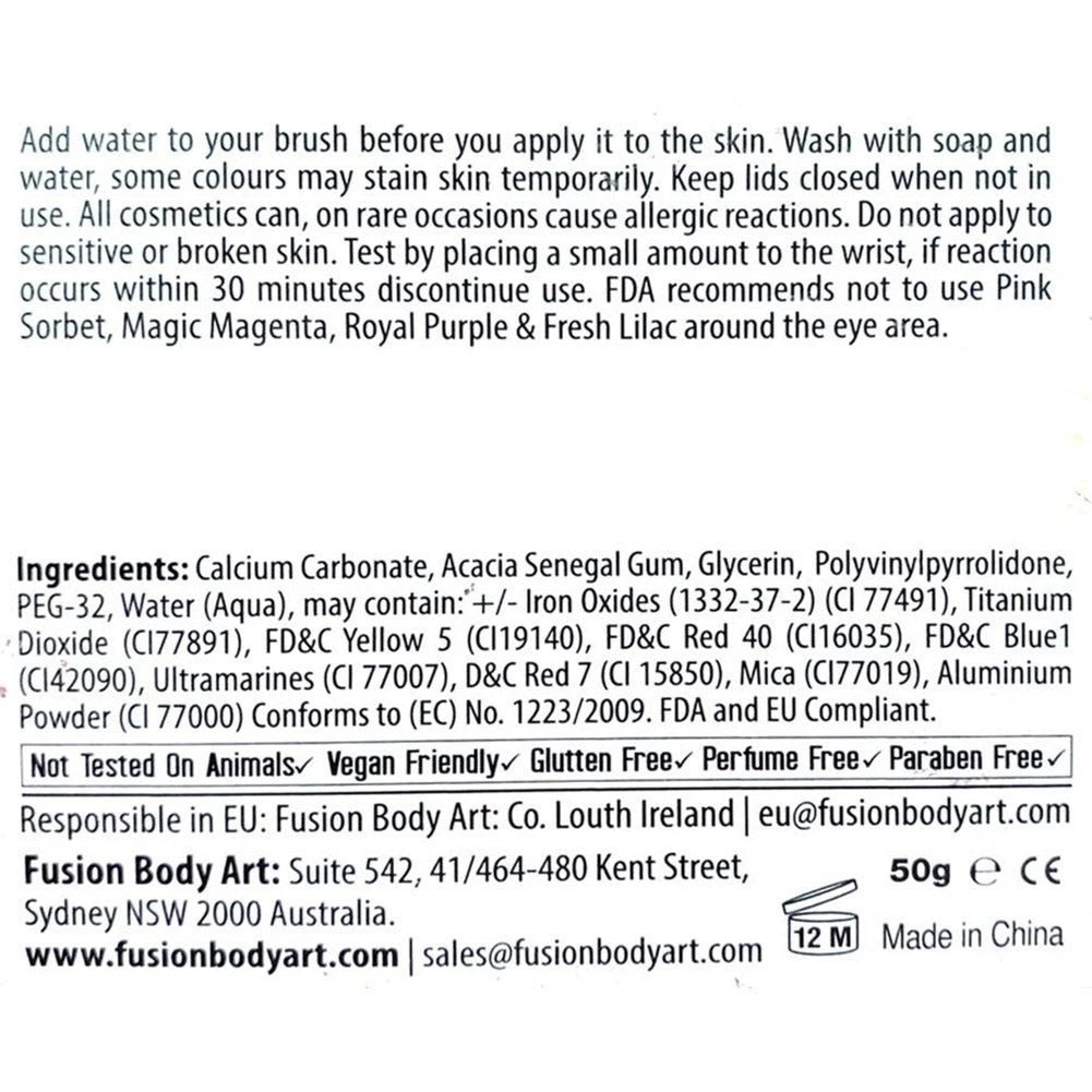 Fusion Body Art Paints are made with high quality, US FDA & EU compliant ingredients that are safe to use anywhere in the body. Fusion Paints are hypoallergenic and free of perfume, lanolin, gluten or paraben. Fusion formula is vegan; made without any animal based ingredients without any testing on animals.
