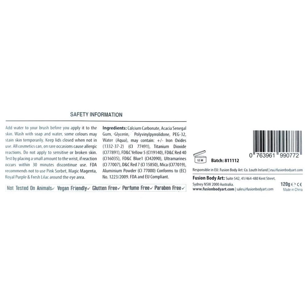 Fusion Body Art Paints are made with high quality, US FDA & EU compliant ingredients that are safe to use anywhere in the body. Fusion Paints are hypoallergenic and free of perfume, lanolin, gluten or paraben. Fusion formula is vegan; made without any animal based ingredients without any testing on animals.