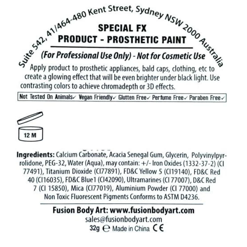 Fusion Body Art Colors are bold & vivid, perfect for painting beautiful designs for any occasion, event, party, Halloween, cosplay, fair and more! UV Neon Orange FX is perfect for tigers, flames, butterflies and more! Works great for linework as well as base work.