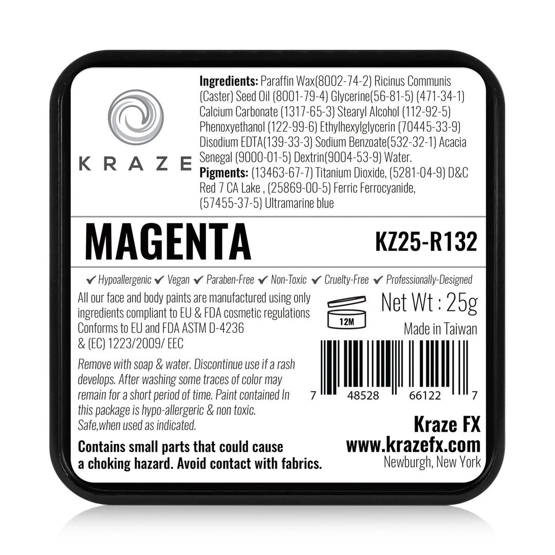 Kraze FX wax-based Face Paints can be used to create colorful designs quickly and easily. Perfect to create a range of designs for parties, events, fairs or Halloween. Kraze FX Magenta is great for line work, but works equally well for blending, base work or layering. Good for 50-150 applications.