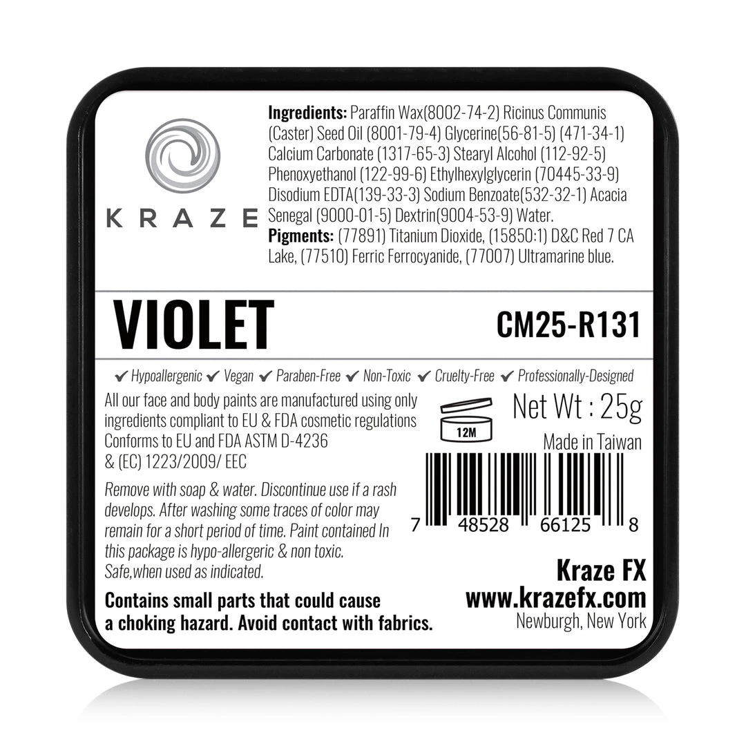 Kraze Face Paints are made with high quality, US FDA & EU compliant ingredients that are safe to use anywhere in the body. Kraze Paints are hypoallergenic and free of nut based ingredients, gluten, perfume or paraben. Kraze formula is vegan; made without any animal based ingredients without any testing on animals. Due to possible staining issues, US FDA warns against use of red, yellow, orange or purple paints near eyes and blue, green or purple shades near lips.
