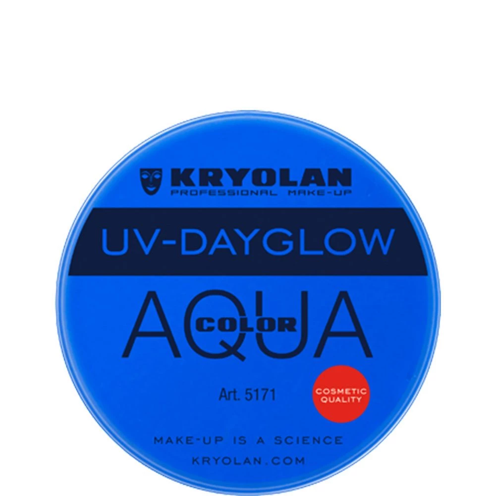 Kryolan Aquacolor Blue Cosmetic Grade UV Dayglow is cosmetic grade, oil free makeup that is strong even in natural light and is more effective under black lights where it reflects brightly in all directions. Kryolan UV makeup is a colorfully intense glycerin-based cake makeup that applies easily with a slightly moistened sponge or brush. Comes in 8 ml size.