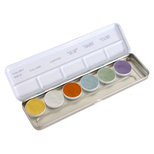 Kryolan’s 6-Color Aquacolor Metallic Palette includes Gold, Silver, Copper, Silver Blue, Silver Green, and Silver Lilac.