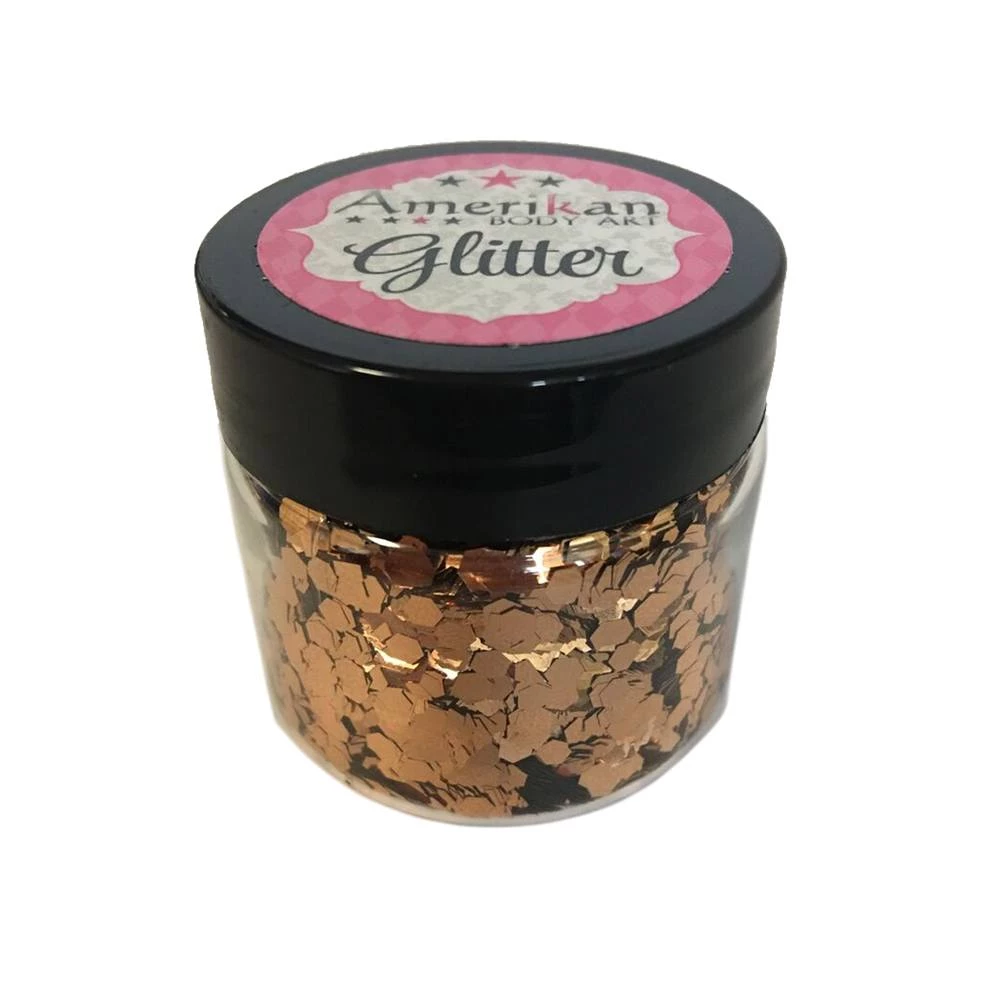 Amerikan Body Art Chunky Glitters are high quality, cosmetic-safe, hex cut, polyester glitters perfect for adding sparkling effects to your face and body painting. Chai Latte Chunky Glitters are metallic golden-bronze glitters. Chunky Glitters can be used for creating glitter freckles, glitter roots and for adding glitz to bodypainting in dance clubs, festivals and parties.