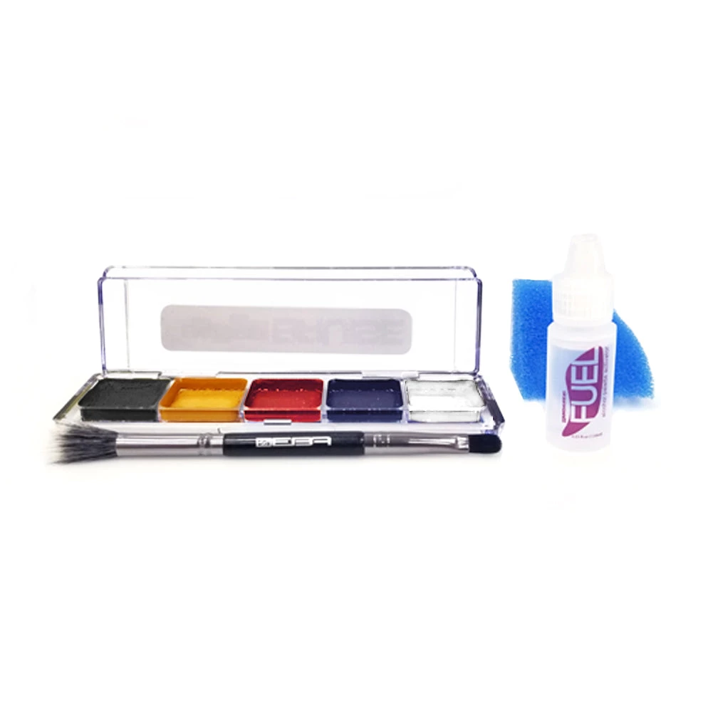 European Body Art Encore SFX Prime SLIM palette includes 5 single colors: Black, Blue, White, Red, Yellow, activator, brush, sponge and detailed instructions. Net weight: 5.25 gm/0.19 fl oz.