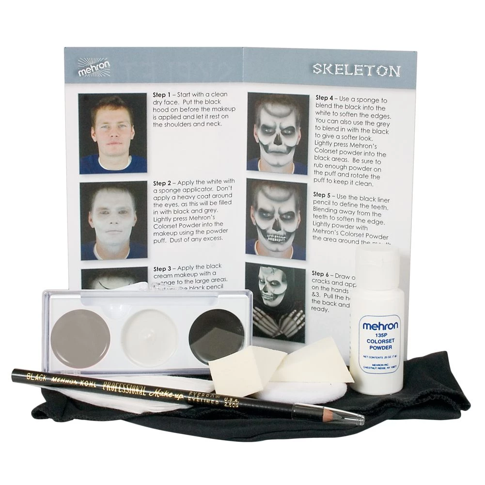 Mehron Premium Skeleton Character Kit has all the essential makeup and supplies needed to create a realistic frightening Skeleton. Mehron has a rich heritage of creating professional character makeup since 1927.