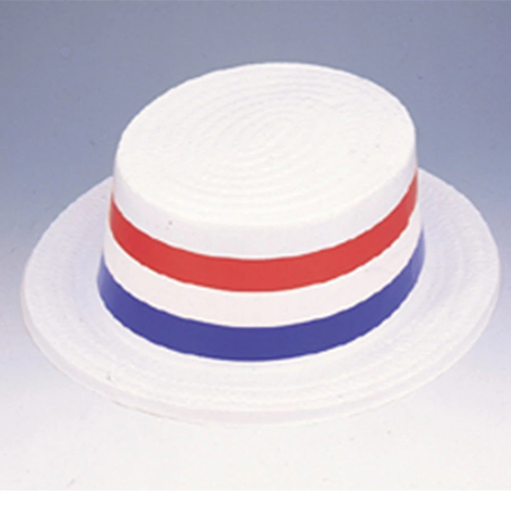 Plastic White Skimmer Hat is a perfect costume accessory to liven up patriotic parties and campaigns. Plastic Skimmer Hat is very comfortable to wear and comes with red,white and blue band. Available in one size that fits most adults. Made in the USA.