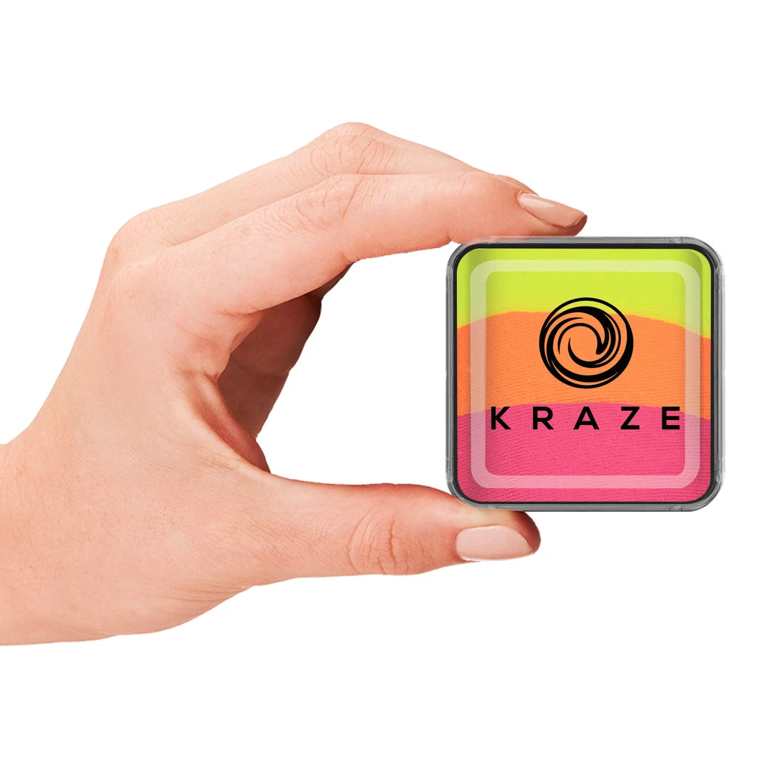 Kraze heavily pigmented, water activated colors are very smooth and are easy to apply and remove. Kraze Paints dry fast to a smudge-resistant, opaque coverage. Flexes with skin movements without cracking. Kraze FX Split  Cakes are easy to apply with a slightly moistened sponge. Kraze Paints can be removed with mild soap and water using a sponge or wash cloth.