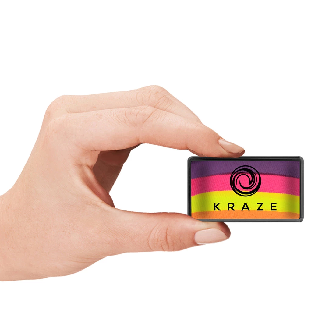 Kraze heavily pigmented, water activated colors are very smooth and are easy to apply and remove. Kraze Paints dry fast to a smudge-resistant, opaque coverage. Flexes with skin movements without cracking. Kraze FX One Stroke Cakes are easy to apply with a slightly moistened brush. Pick up multiple colors by swiping a flat brush on the surface of the cake in one direction and apply on skin. Kraze Paints can be removed with mild soap and water using a sponge or wash cloth.