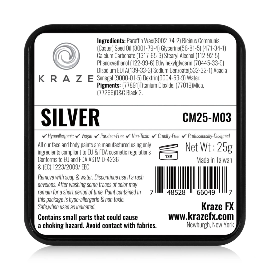 Kraze FX wax-based Face Paints can be used to create colorful designs quickly and easily. Perfect to create a range of designs for parties, events, fairs or Halloween. Kraze FX Paint is great for line work, but works equally well for blending, base work or layering. Metallic Silver can be used for adding shimmer accents to your designs. Good for 50-150 applications.