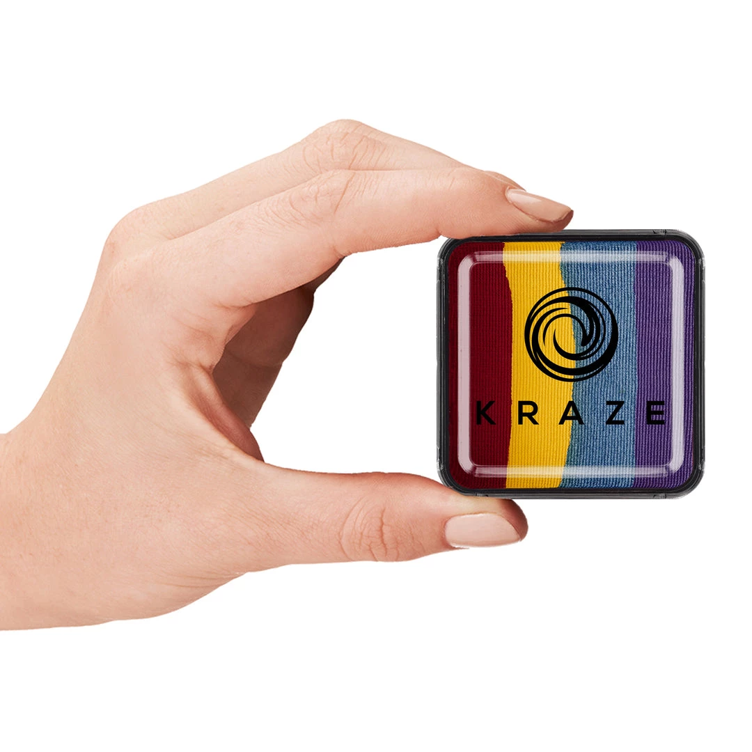 Kraze heavily pigmented, water activated colors are very smooth and are easy to apply and remove. Kraze Paints dry fast to a smudge-resistant, opaque coverage. Flexes with skin movements without cracking. Kraze FX Split  Cakes are easy to apply with a slightly moistened sponge. Kraze Paints can be removed with mild soap and water using a sponge or wash cloth.