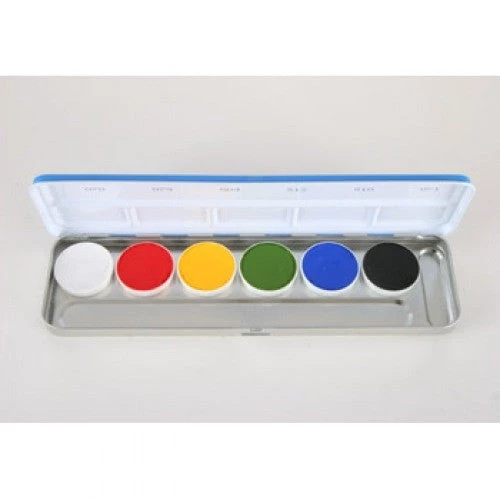 Kryolan’s Aquacolor Vivid Palette includes six essential and popular 4 ml colors in a sturdy and refillable metal palette.
