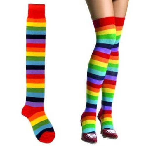 Fun, brightly colored knit socks will add excitement to any outfit, clown or otherwise! Made from 86% acrylic, 8% nylon and 6% elastic. 27 inch long rainbow thigh highs fit about a 12- 20 inch circumference thigh and women’s shoe size 5 and up.