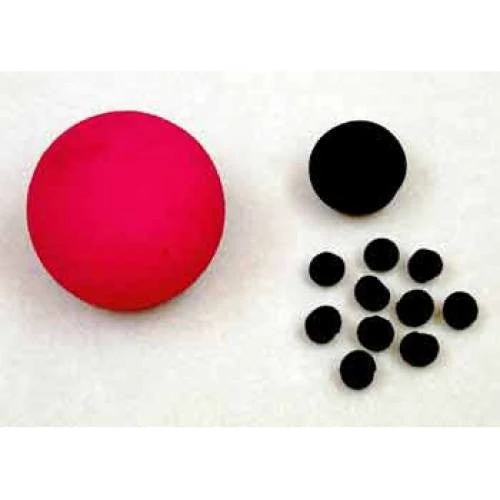 A 2 inch red foam ball and a 2 inch black ball are pushed into a fist, turning into a 4 inch red ball and 7 small black balls!
