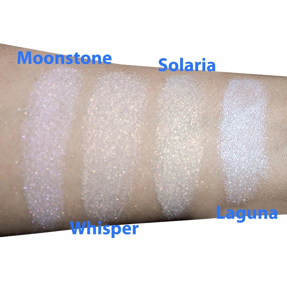 Highlighter Powders can be used for highlighting cheeks, lips, eyes and body. Solaria Highlighter appears plain white in jar. Color change happens depends on how they are applied, whether on bare skin or over primer and how light hits them. Solaria highlighter gives a white with golden sparkle.
