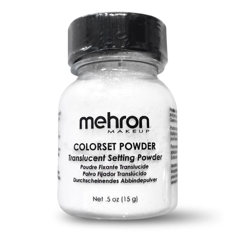 Mehron ColorSet Powder is a translucent setting powder that can be used to set any cream makeup for a durable, natural finish. Apply using a powder puff over your makeup to absorb excess moisture or oil. Use a powder brush to dust off excess powder. Comes in 0.5 oz size.