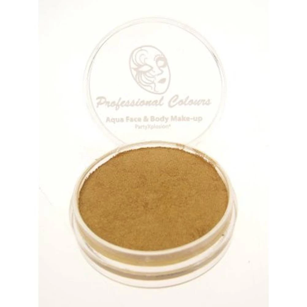 PartyXplosion Pearl Gold Aqua Face Paint is a highly pigmented, wax based cake makeup that provides vibrant and opaque coverage. Metallic colors can be used to add shimmer effects to your designs.
